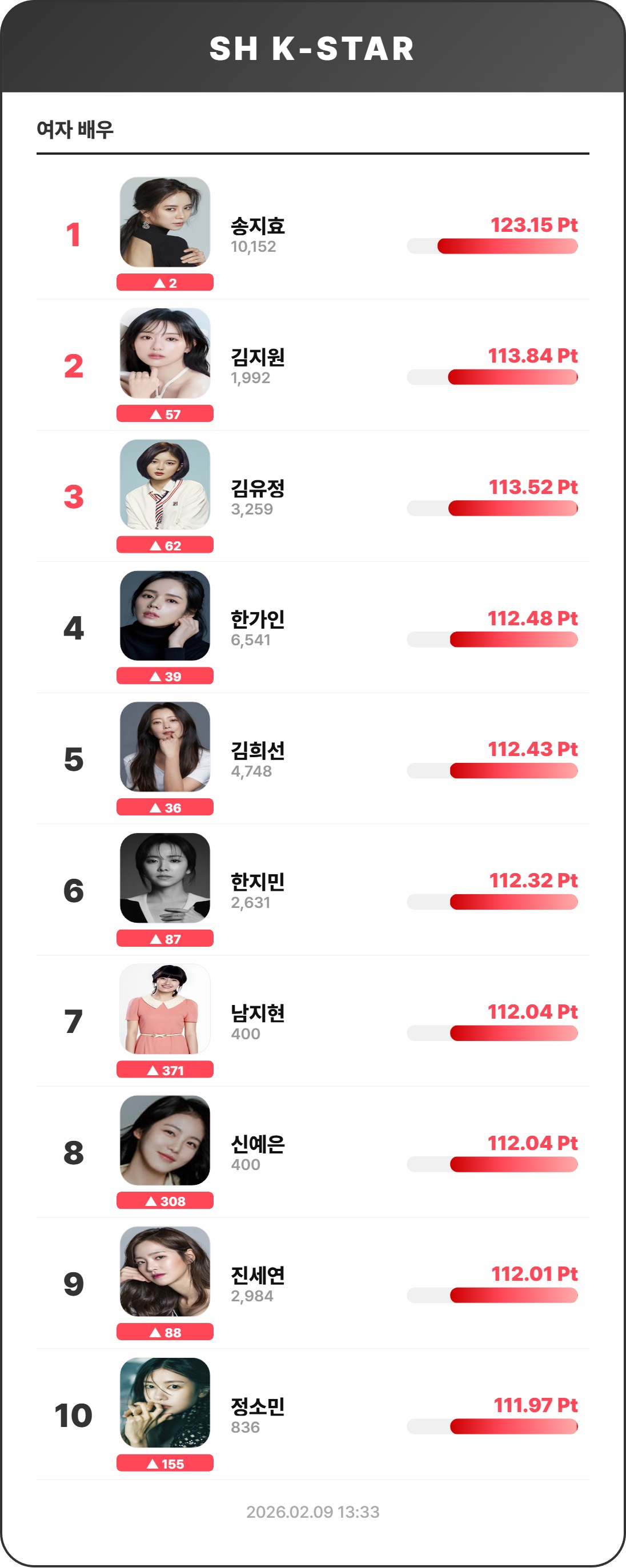현재 집계된 여자 배우 TOP 10의 상세 데이터입니다. (기준 일시: 2026.02.09 13:33)